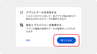 ②インストールが完了しましたらヘルスコネクトを起動して「使ってみる」ボタンをタップしてください。