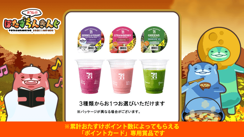 (2)【ぽたすらんきんぐ秋】セブンカフェ スムージー 3種類から1つ(ベリーベリーヨーグルトスムージー・いちごバナナソイスムージー・グリーンスムージー) 100名様